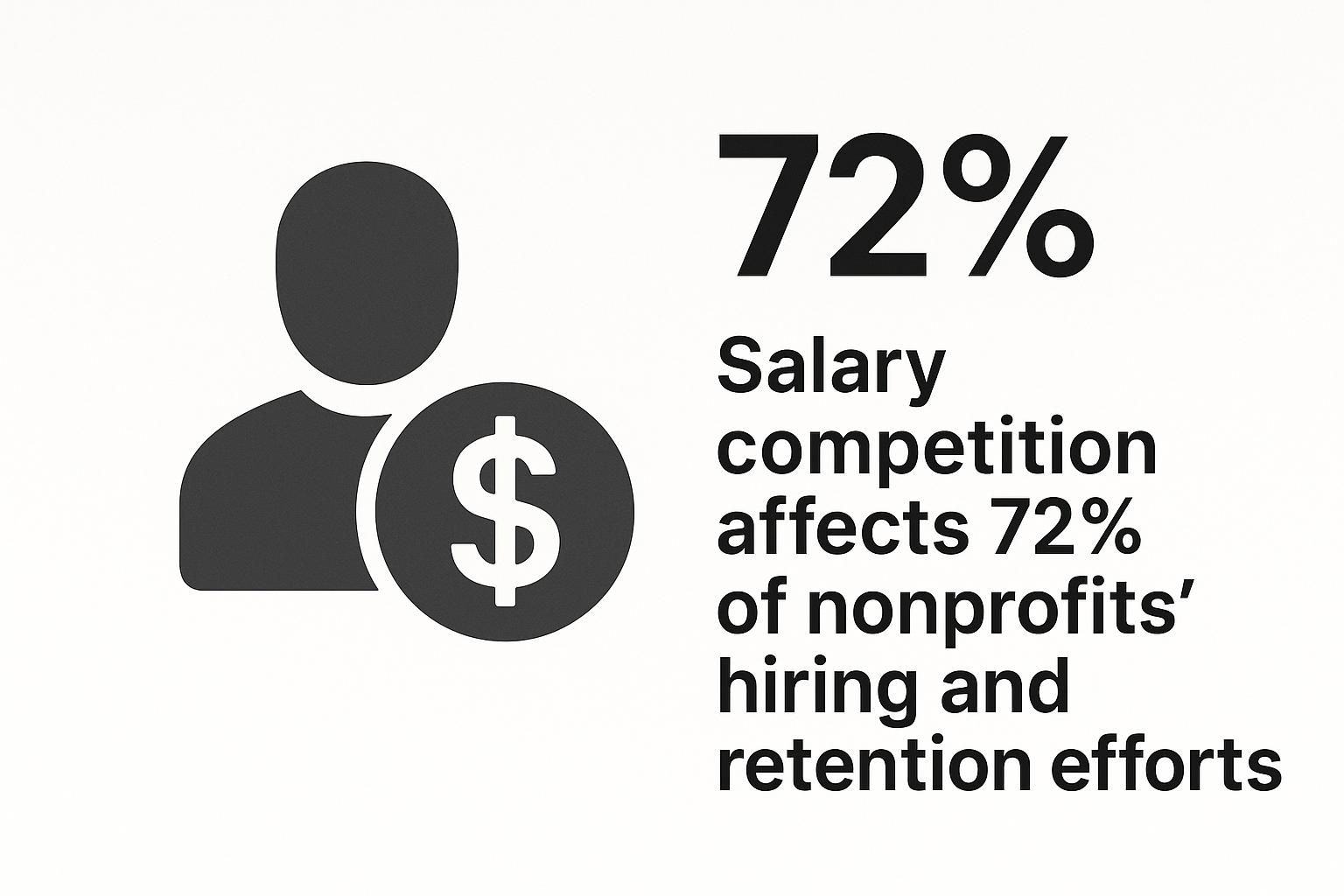 Nonprofits often struggle to compete on pay, which can hinder hiring. Salary competition affects 72% of nonprofits’ hiring and retention efforts. Even when roles are filled, training and retention can be difficult given resource constraints.