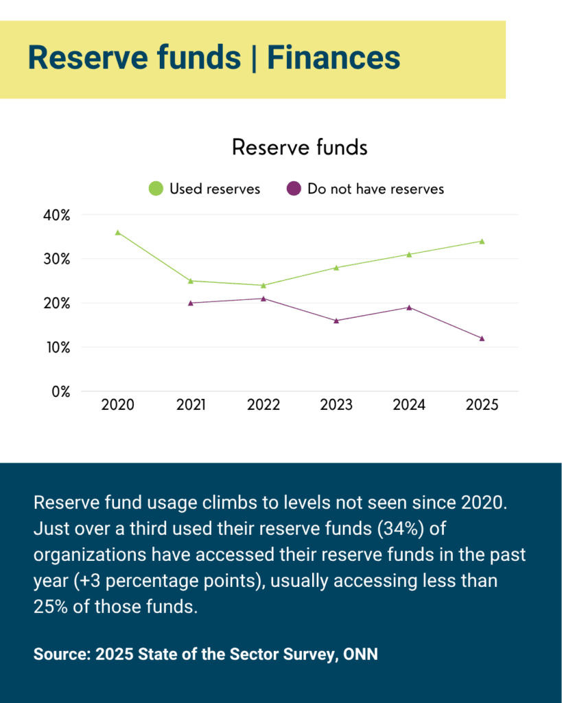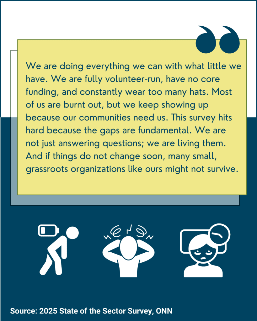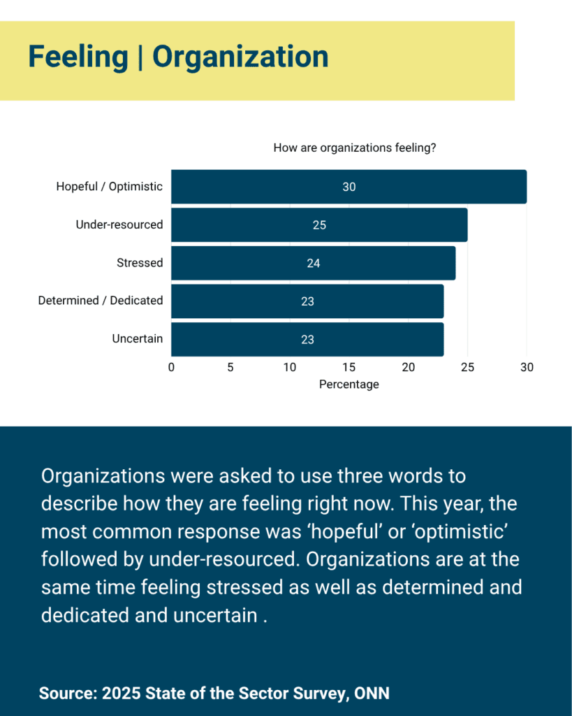 - The polarization seen in last year’s survey around how nonprofits feel in the current moment continues: 30 per cent are hopeful, 25 per cent are under-resourced, and 24 per cent are feeling stressed, tired, and/or fatigued.